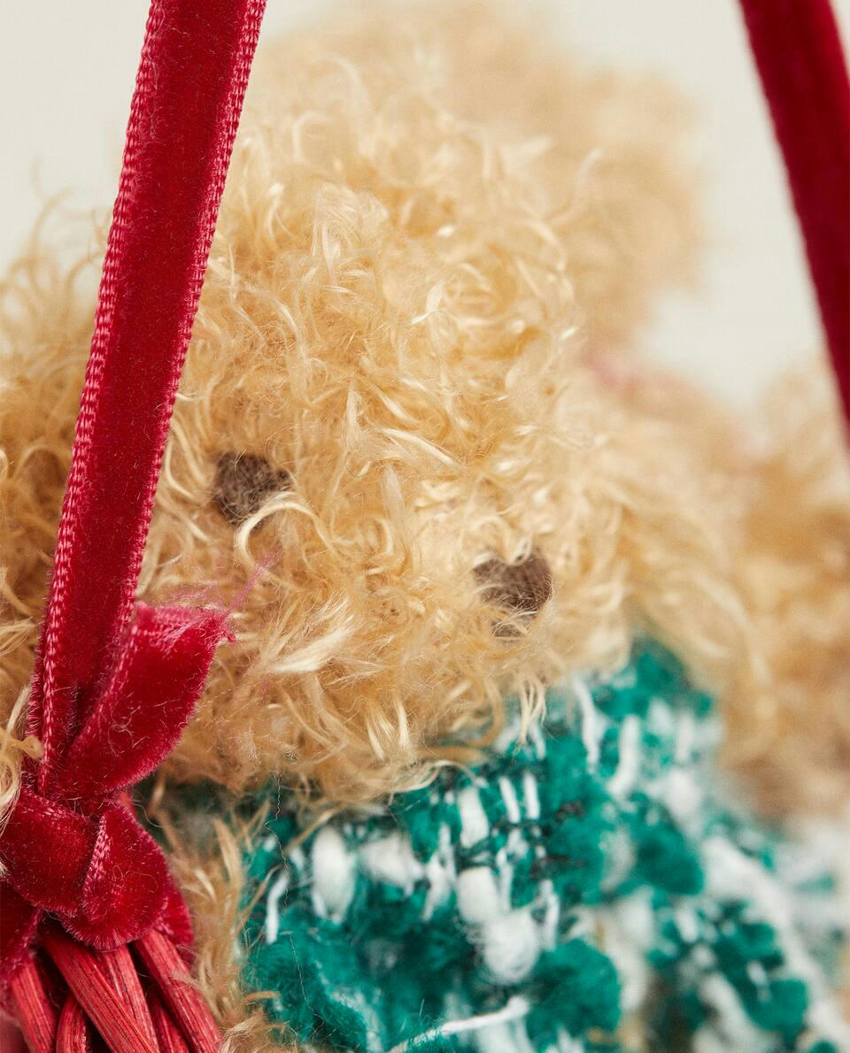 Rattan Christmas tree decoration in the shape of a rabbit with a knit scarf in a sleigh.